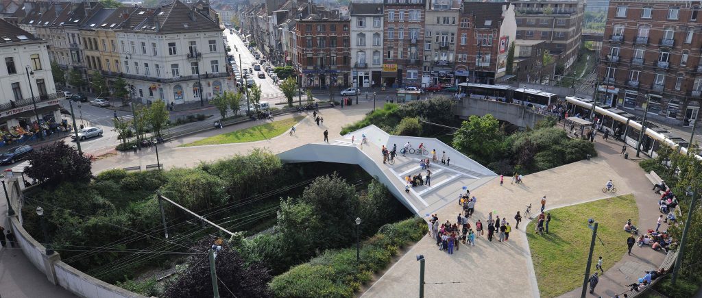 En 2014, dans le cadre du Contrat de Quartier Navez-Portaels (2008-2012), le premier aménagement est complété par l’installation d’une passerelle en acier qui enjambe le chemin de fer. Celle-ci est conçue par l’association momentanée MSA-Ney & Partners. Entre mobilier urbain, ouvrage d’art et espace public, cette intervention vise à réduire la fragmentation de l’espace en investissant le vide qui sépare les deux parties de la place et ainsi, renforcer l’identité spatiale du lieu.